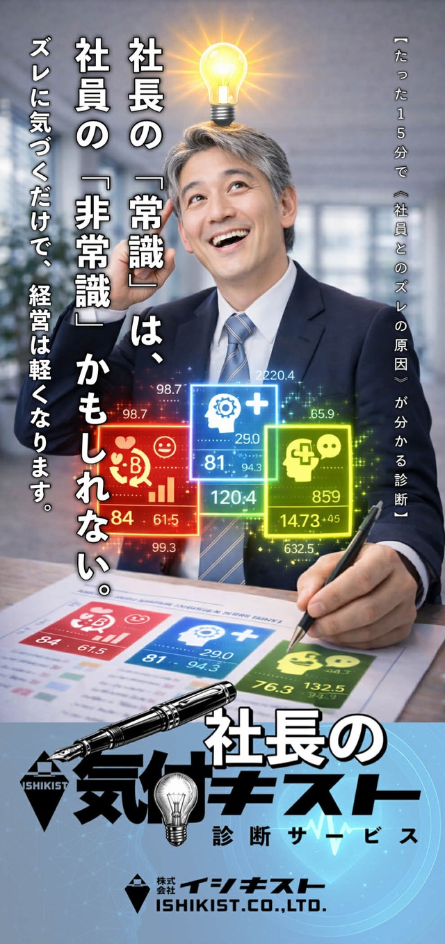 ※こちらは診断のみのプランです。 《詳細はこちら⇩》 【社長の気付キスト診断サービス詳細】 https://shachonokizukist.studio.site 【社員とのズレは、努力不足ではありません。】 何回言っても伝わらない。 言い方を変えても噛み合わない。 結局、社長だけが判断疲れする。 それは、あなたの力量でも社員の能力でもなく、 「社長と社員の構造が違う」だけで起きています。 社長は「結論と判断」で動く。 社員は「受け取り方と安心」で動く。 この構造差を知らずに努力を重ねるほど、 ズレは縮まらず、時間とコストだけが増えます。 その“原因”を、15分で可視化するのが 『社長の気付キスト診断』です。 【人の問題に見えるものの多くは、“構造のズレ”です】 同じ言葉を使っていても、社長と社員は内部処理が違います。 ・判断の基準が違う ・情報の拾い方が違う ・ストレス反応が違う ・動き出すスイッチが違う このズレを放置すると、積み上がるのは「誤解」だけではありません。 会話のやり直し。 採用のミスマッチ。 離職の連鎖。 そして、社長の判断疲れ。 経営を静かに削るコストになります。 【なぜ“15分”で原因が見えるのか】 理由はシンプルです。 3つの異なる方向性の診断原理を重ね、ズレの原因だけを抽出する設計だからです。 ・表に出る動き ・内側で優先される軸 ・考え方と動き方の偏り この3方向を重ねると、 「何がズレを生み、どこで詰まり、どうすれ違うか」が 短時間でもブレにくく浮き上がります。 時間をかける診断ではなく、 経営判断に必要な核心だけを抜き出す診断です。 【返ってくるのは、“経営の設計図”です】 診断結果は、数字と言葉の両方で返ります。 レポートはA4で約5〜6枚。 そこに整理されるのは、次の内容です。 ・あなたの思考と反応の設計(取扱説明書) ・社員とのズレが起きる理由(原因の構造) ・社員/家族/経営者仲間とのズレの起点 ・判断疲れが起きる条件と、力が出る条件 ・今後、器を効率的に広げるための挑戦の方向性 つまり、 「感覚の経営」から「設計図の経営」へ移行できます。 【構造が見えた社長ほど、こう変わります】 ・意思決定が速くなる ・無駄なストレスが減る ・社員との会話が軽くなる ・マネジメントが仕組み化しやすくなる 多くの社長が最初に言うのは、 「当たってる」ではなく、 「だからズレていたのか」です。 これは当てる診断ではありません。 経営を軽くする診断です。 【実際に受けた経営者の声】 「衝突の原因が“性格”ではなく“構造”だと分かった瞬間、会話が変わりました。判断が楽になりました。」 (会社代表・50代) 「感覚でやっていたマネジメントが、数字と言葉で整理されました。無駄に悩む時間が減りました。」 (経営者・40代) 「一般的な診断とは別物でした。経営の取扱説明書を手に入れた感覚です。」 (企業経営者・30代) 【診断メニュー】 ● 診断レポートのみ(A4レポート5〜6枚) 通常 50,000円 ● レポート+Zoomフィードバック30分 通常 80,000円 ※先着30名限定 導入価格 → レポート 30,000円 → Zoom付き 50,000円 【今ここで、申し込む理由】 ズレが構造なら、努力で押すほど消耗します。 原因が見えれば、判断も会話も一気に軽くなります。 「このまま同じズレを繰り返す前に」 あなたの経営の設計図を確認してください。