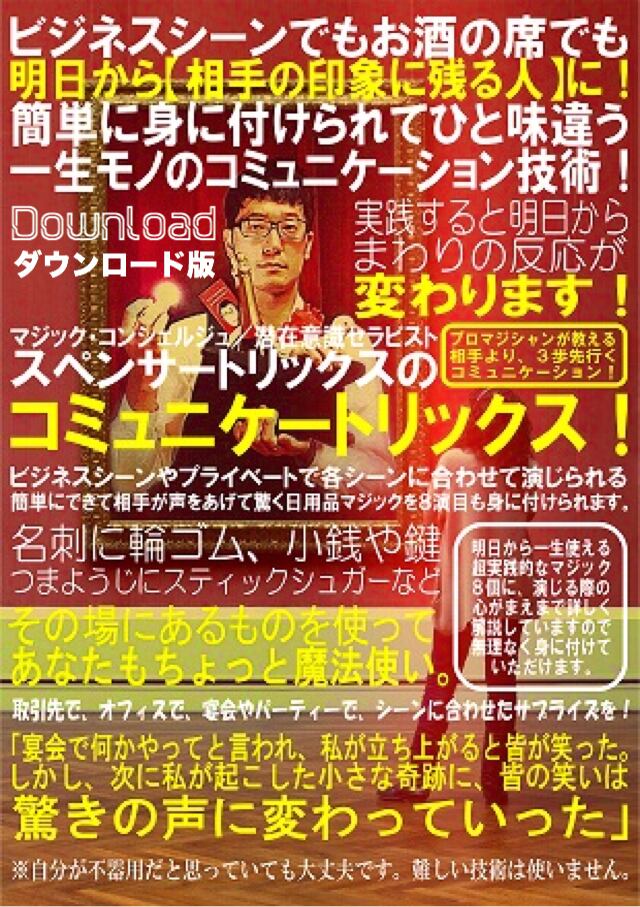 日常でさりげなく演じられる、コミュニケーションに特化した厳選マジックを7演目と基本技法1つ、 初心者が陥りがちな心理状態とその対処法、マインドセットの解説など、マジックに初めて挑戦する 会社員などの一般の方が持つ「身の回りの日用品でさりげなく演じられるマジックを覚えたい」というニーズに徹底的に応える内容にしてあります。